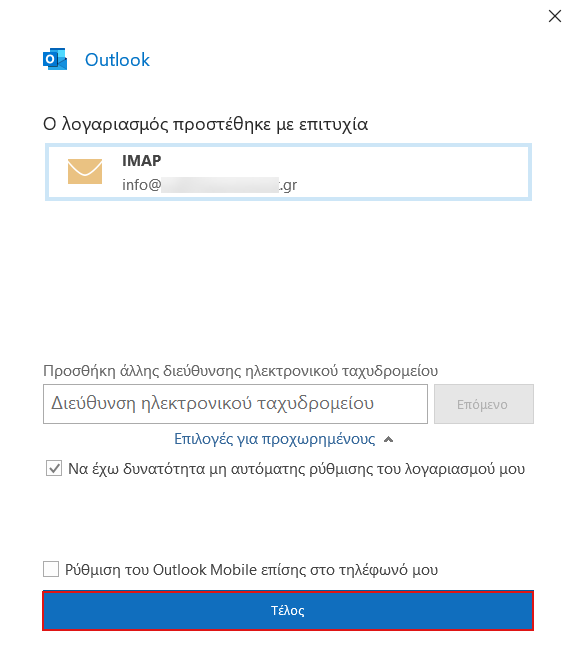 Πατήστε Τέλος (Finish) για να χρησιμοποιήσετε το email σας μέσα από το Outlook 2016 ????